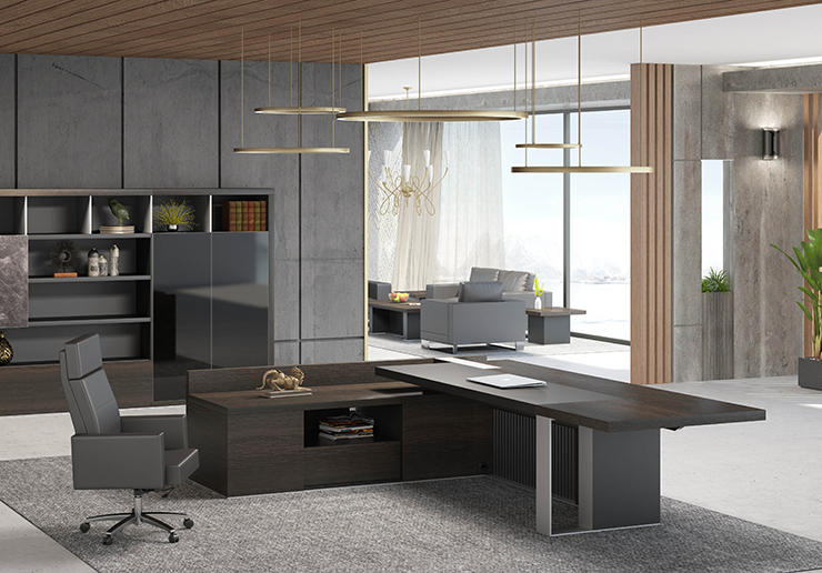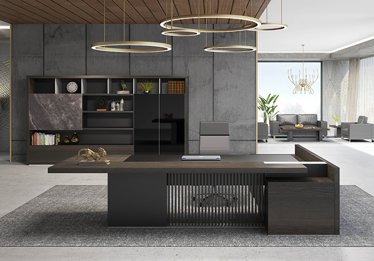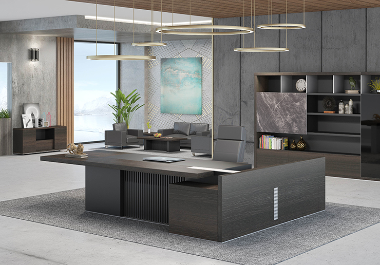 3、結(jié)構(gòu):臺(tái)面復(fù)合厚度60mm,3個(gè)模塊組成,主臺(tái)面為捫皮工藝,輔臺(tái)面為泰坦胡桃,與附柜連接臺(tái)面為拉絲鋁合金裝飾。臺(tái)腳采用45度拼接結(jié)構(gòu),拉米諾連接方式。工藝高端附柜配置多功能集成插座。附柜配置了抽屜,掩門以及預(yù)留了主機(jī)位,線路收納等存儲(chǔ)空間。附柜掩門及抽屜門板拉手為隱藏式設(shè)計(jì)。配套門鉸和導(dǎo)軌均為德國(guó)進(jìn)口品牌