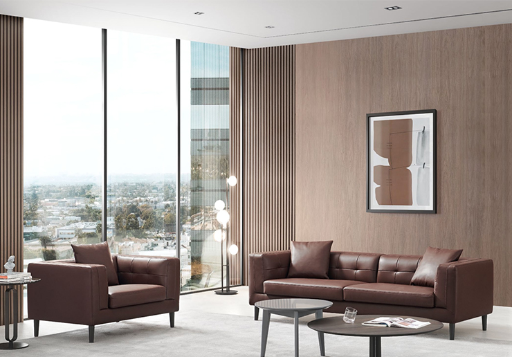 使用進口一級牛皮,抗張強度≥15N/mm2,撕裂強度≥35N/mm2 。皮面平整、柔軟、舒適、透氣性好,防污、防蛀、無退色,無瑕疵,無蝕味、無甲醛及二甲苯等異味,且任何部位無皮癬;內(nèi)部采用優(yōu)質(zhì)高彈性阻燃泡棉底座密度高達45kg/m3以上,其它部位不小于35Kg/立方米,拉伸強度不小于85Kpa;框架主體為東北硬雜木。實木龍骨沙發(fā)框架、實木沙發(fā)腳等所用木材含水率要求≤12%。五金配件均為進口名牌,各種配件、連接件安裝嚴密、平整、端正、牢固,結(jié)合處無崩茬或松動,無少件、漏釘、透釘現(xiàn)象。